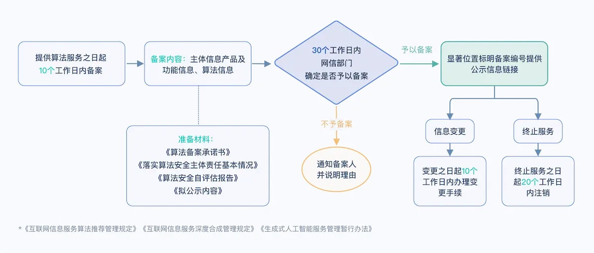 (1)算法备案:面向对象更为广泛,涵盖了各类算法服务,包括但不限于个性化推送类、排序精选类、检索过滤类、调度决策类以及生成合成类(含深度合成服务)等多种算法类型。无论是简单的推荐算法,还是复杂的决策算法,只要涉及算法服务的提供,均在算法备案的范畴之内。